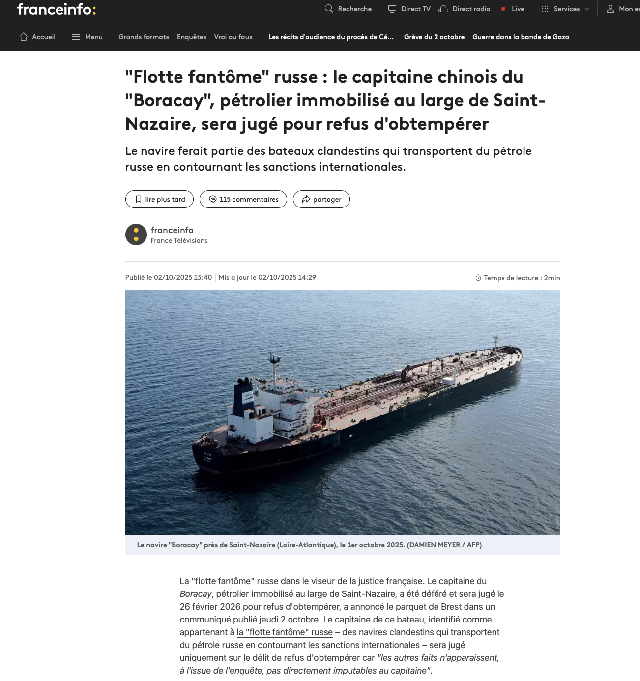 On l’annonçait comme un trophée de guerre économique : le Boracay, navire de la flotte fantôme russe, devait incarner la fermeté européenne. Résultat : une garde à vue, une convocation à Brest et un tanker qui file vers l’Inde. Tout ça pour ça.