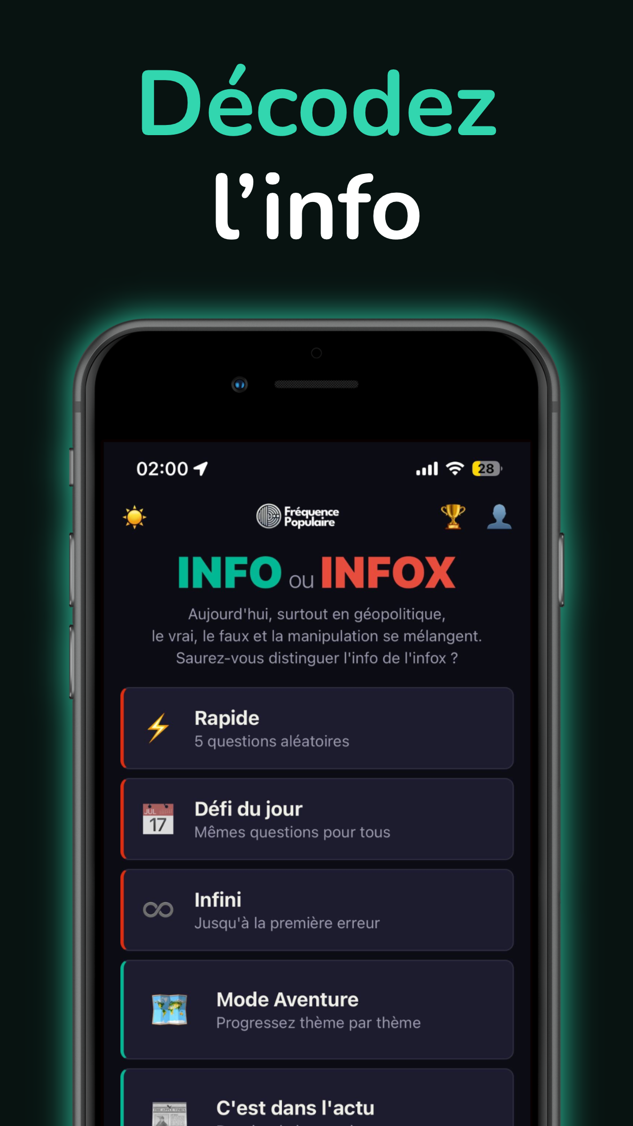 C’est dans cette optique que Fréquence Populaire lance une nouvelle application mobile éducative appelée « Info ou Infox ? ». Le but est simple : aider chacun à tester et renforcer son esprit critique face à l’information géopolitique, grâce à un format ludique et facile d’accès.