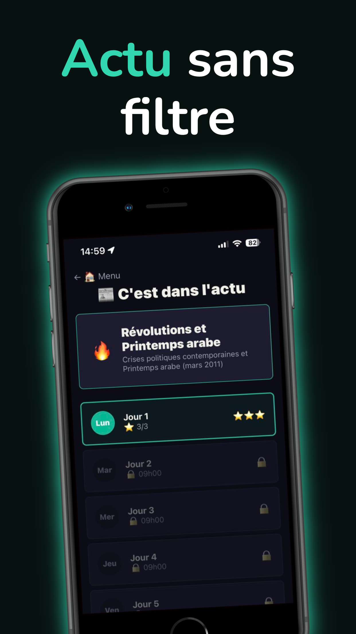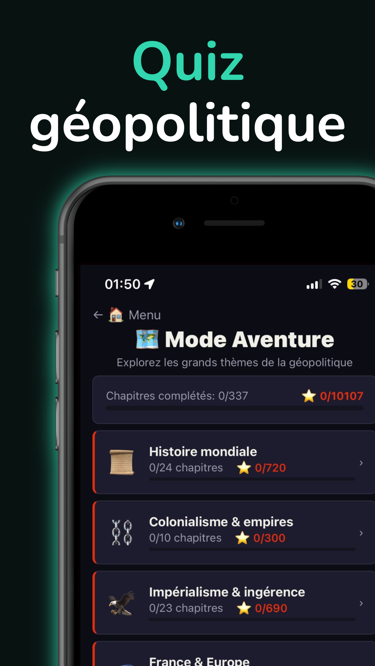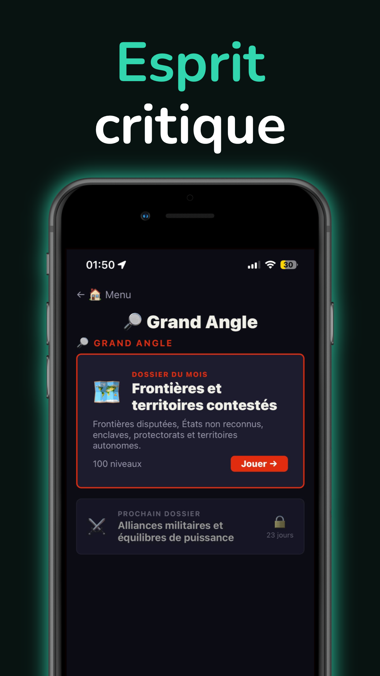 L’application propose plusieurs modes de jeu pour s’adapter au rythme de chacun. Certaines parties durent seulement quelques minutes, idéales pour jouer dans les transports, pendant une pause ou dans une salle d’attente. D’autres formats permettent d’explorer plus en profondeur des dossiers sur l’actualité internationale ou l’histoire des relations internationales.