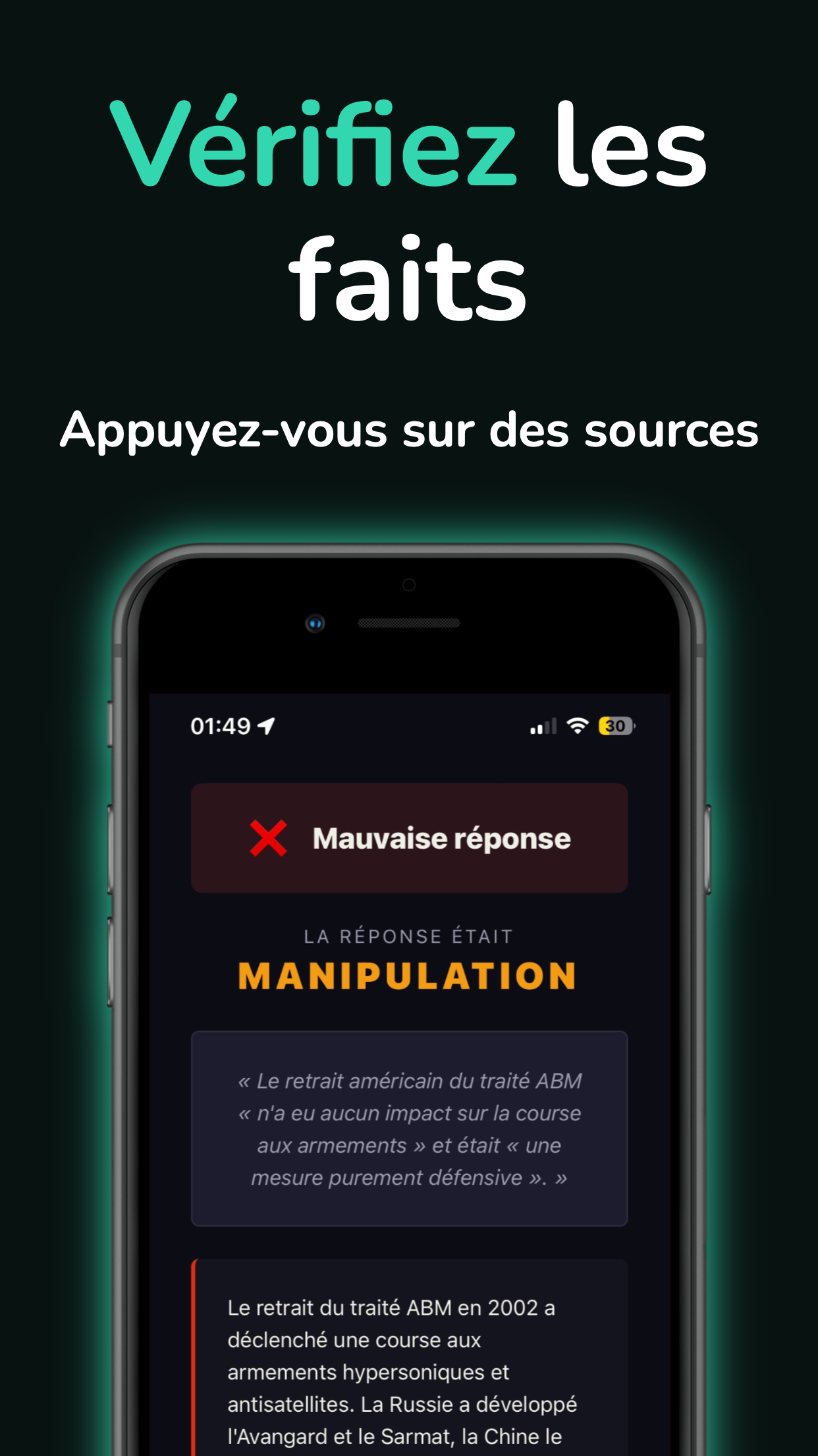 Chaque réponse est expliquée pour aider à comprendre pourquoi une affirmation est correcte, fausse ou manipulatrice. Le jeu devient ainsi un moyen d’apprendre tout en développant des réflexes d’analyse face aux informations du quotidien.