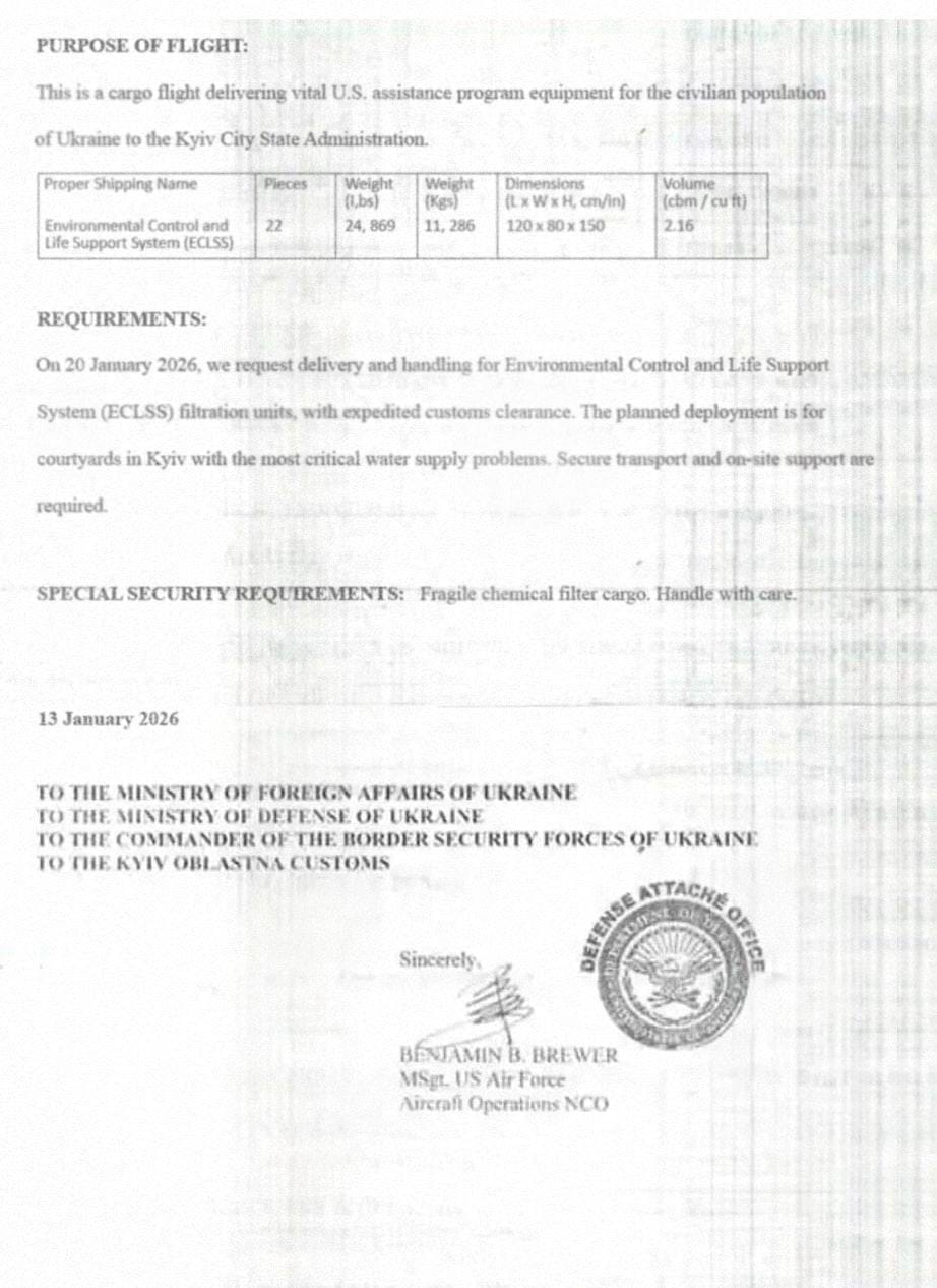 Le courrier est adressé au ministère ukrainien des Affaires étrangères, au ministère de la Défense, au commandement des forces de garde-frontières et aux services des douanes de l’oblast de Kiev. Il est signé par un sous-officier de l’US Air Force, rattaché à un bureau d’attaché de défense.